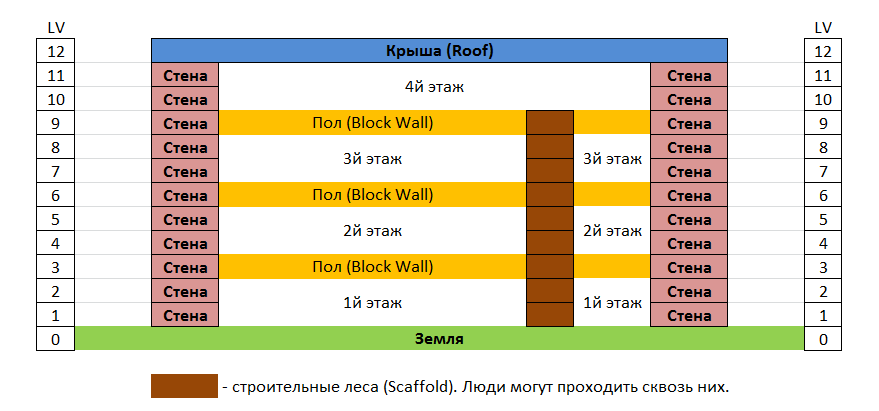 - Переходим на lv4. Уже на нем мы можем размещать зоны и предметы. Строим два уровня стен по периметру (lv4-lv5), не забываем достраивать колонну из лесов.