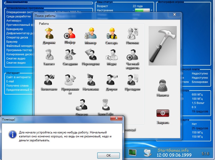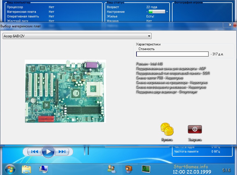 Компьютерная эволюция - уникальная, познавательная и для некоторых ностальгическая игра, которая вернет вас в 1999 год и предоставит вам возможность вновь купить свой первый компьютер, для которого с каждым годом можно приобретать новые программы, операционные системы и комплектующие. Более того, игра сделана как реальный симулятор жизни, в котором кроме компьютера нужно позаботиться о: жилье, работе, машине, отдыхе и т.п. Но основной акцент сделан на компьютерах и все что с ними связано, начиная с 1999 и так аж до 2012 года.