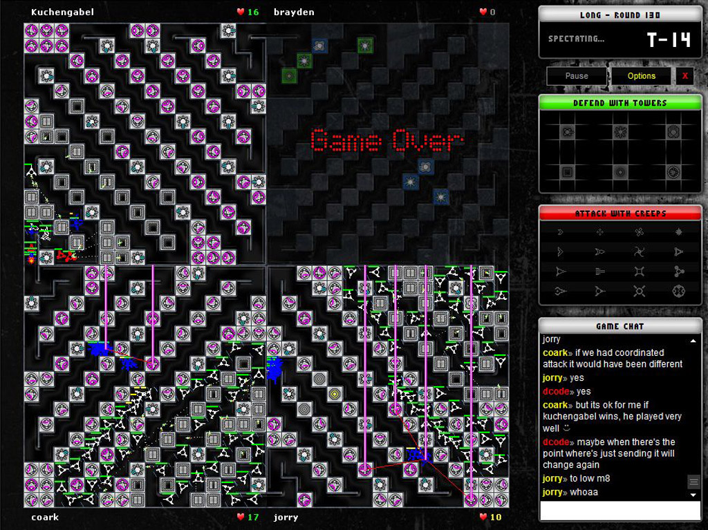 CreepTD - мультиплеерная онлайн игра до 4 игроков, цель которой заключается в победе путем истреблении всех врагов. На каждом уровне нужно строить и улучшать разные башни, которые будут защищать вас. С самого начала в вашем распоряжении 20 жизней, каждый пройденный вашу защиту враг - отбирает 1 жизнь. Не смотря на это, у вас есть возможность перенаправлять врагов на конкурентов, которые и будут отгребать вместо вас.